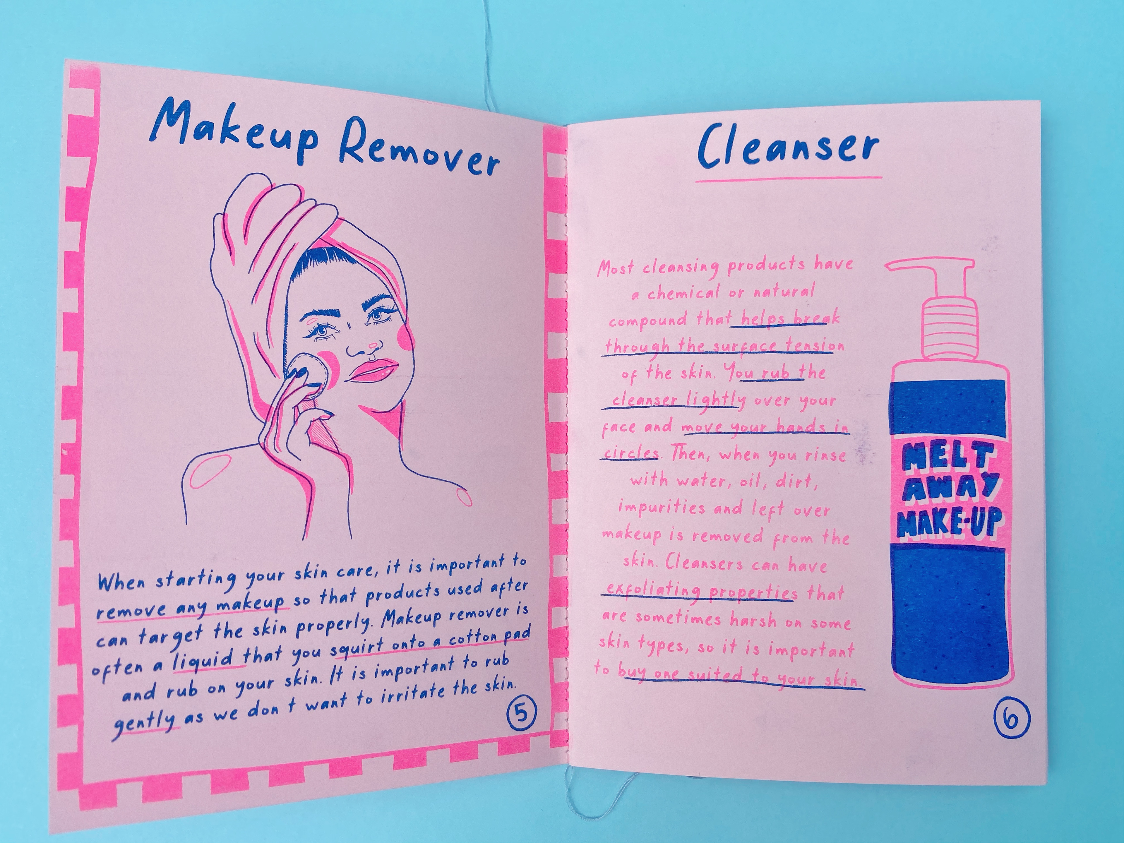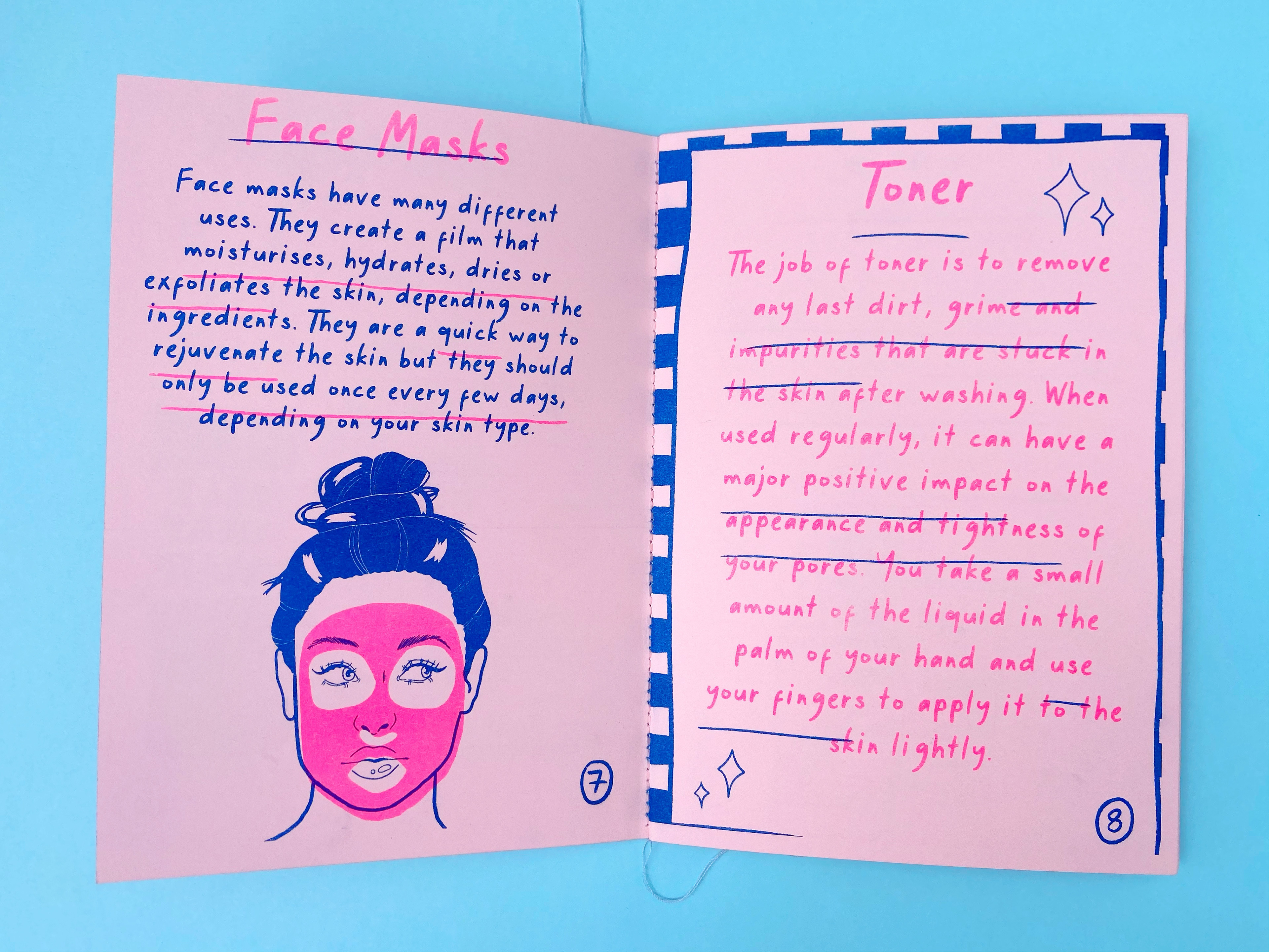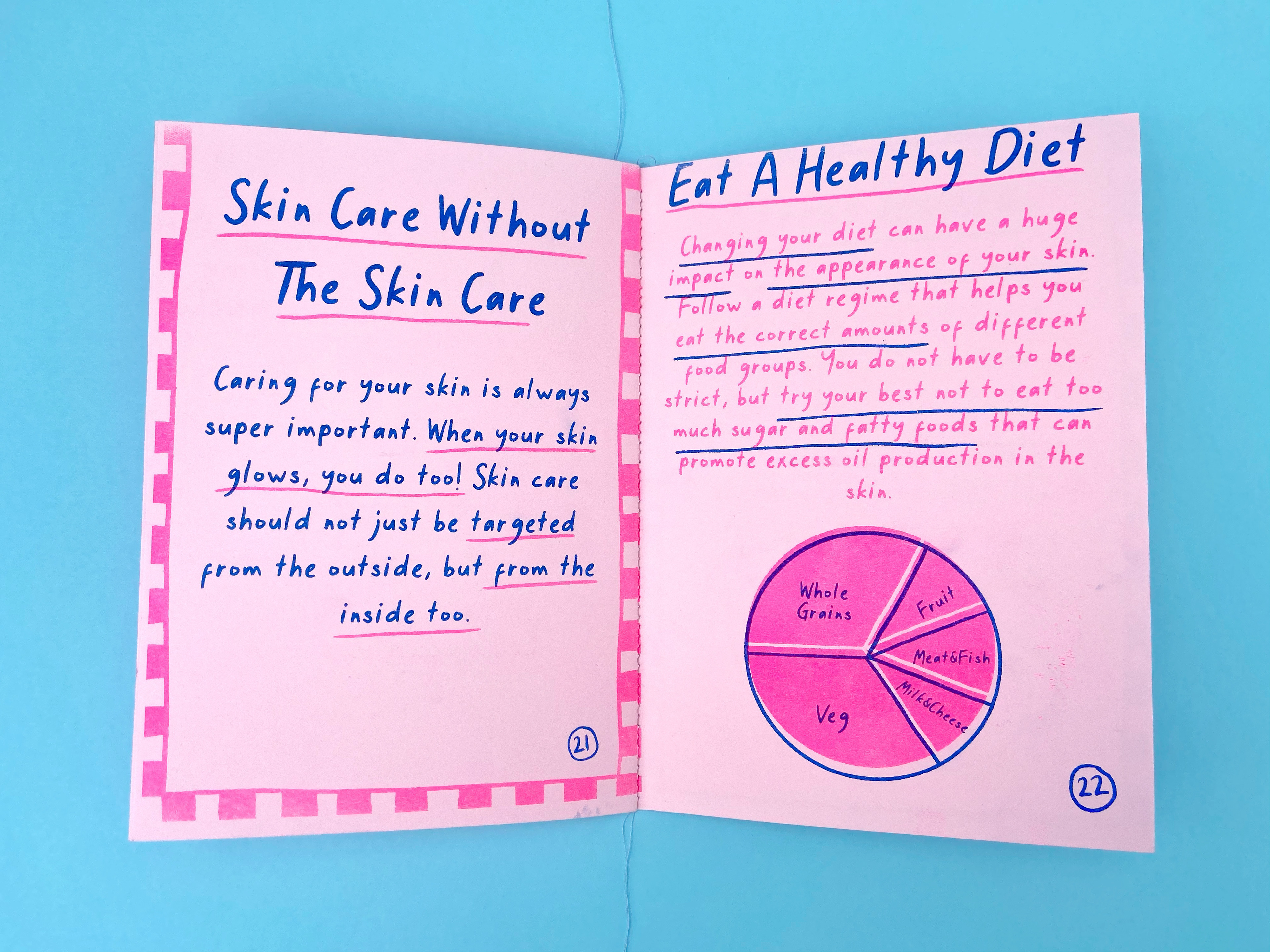 This zine was created in my second year of university using a risograph printer. We were tasked to create a set of instructions for a specific audience. I chose to make a guide to skin care, to help teens combat dry, greasy and acne prone skin.