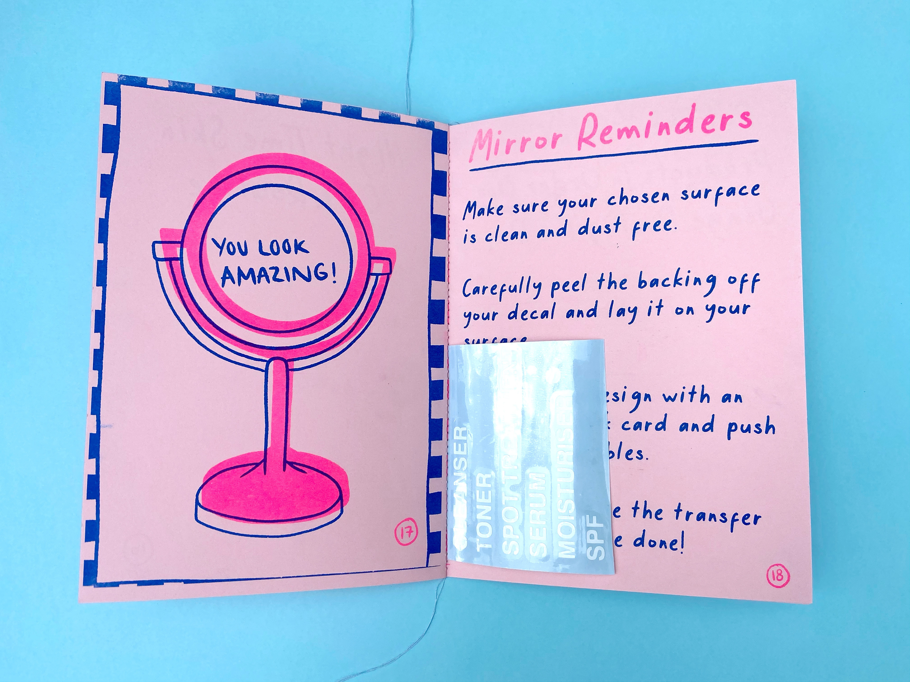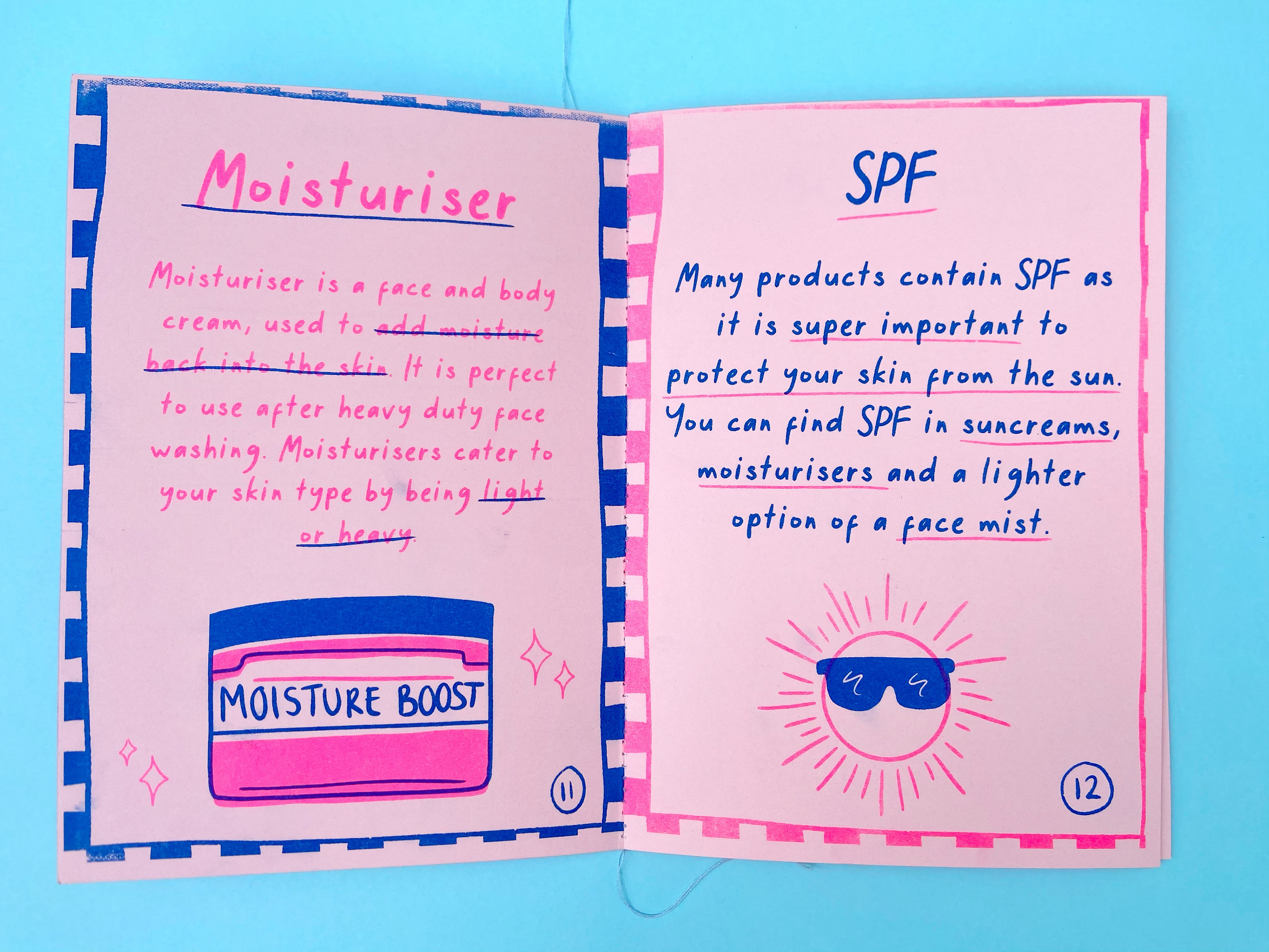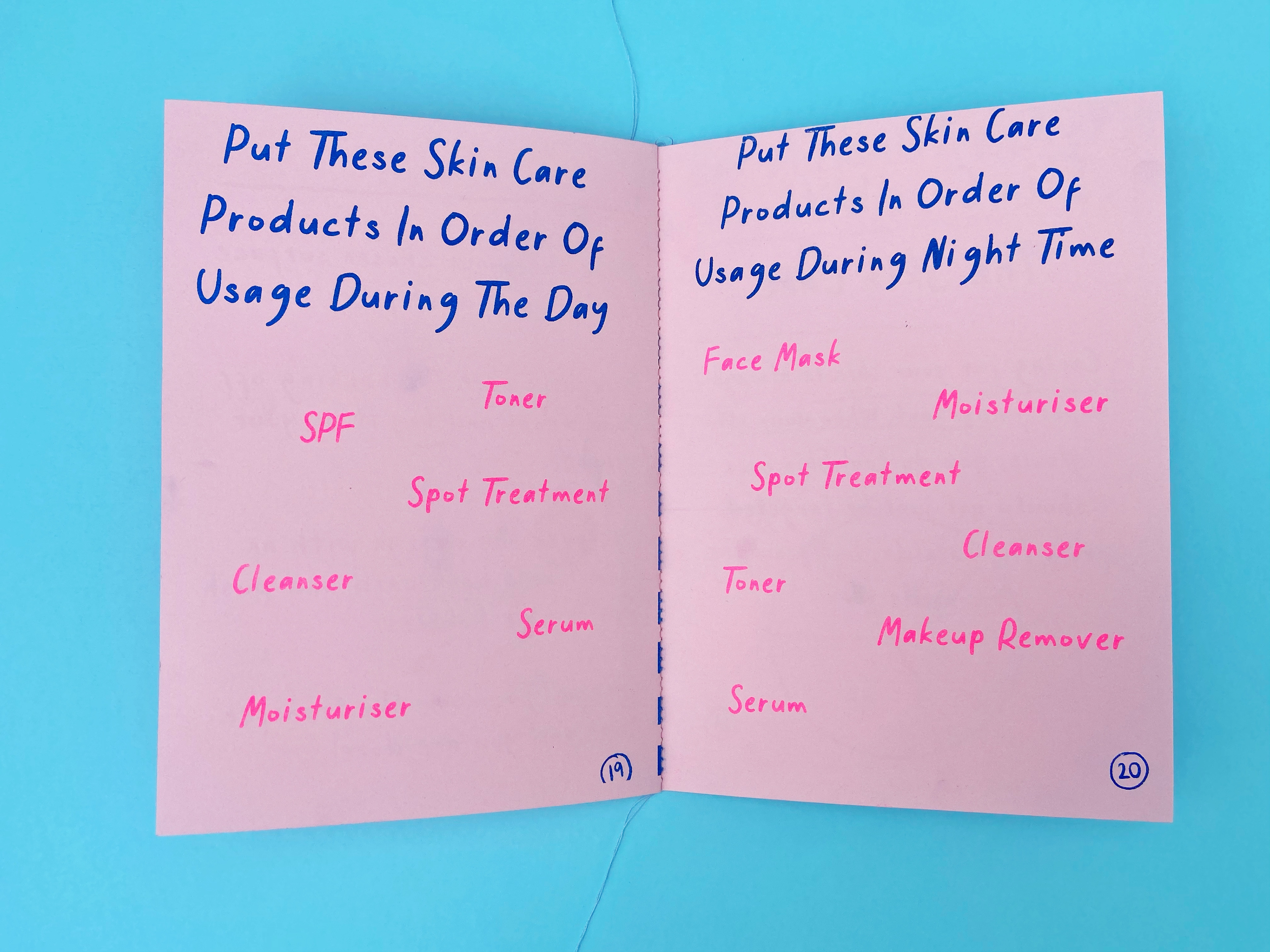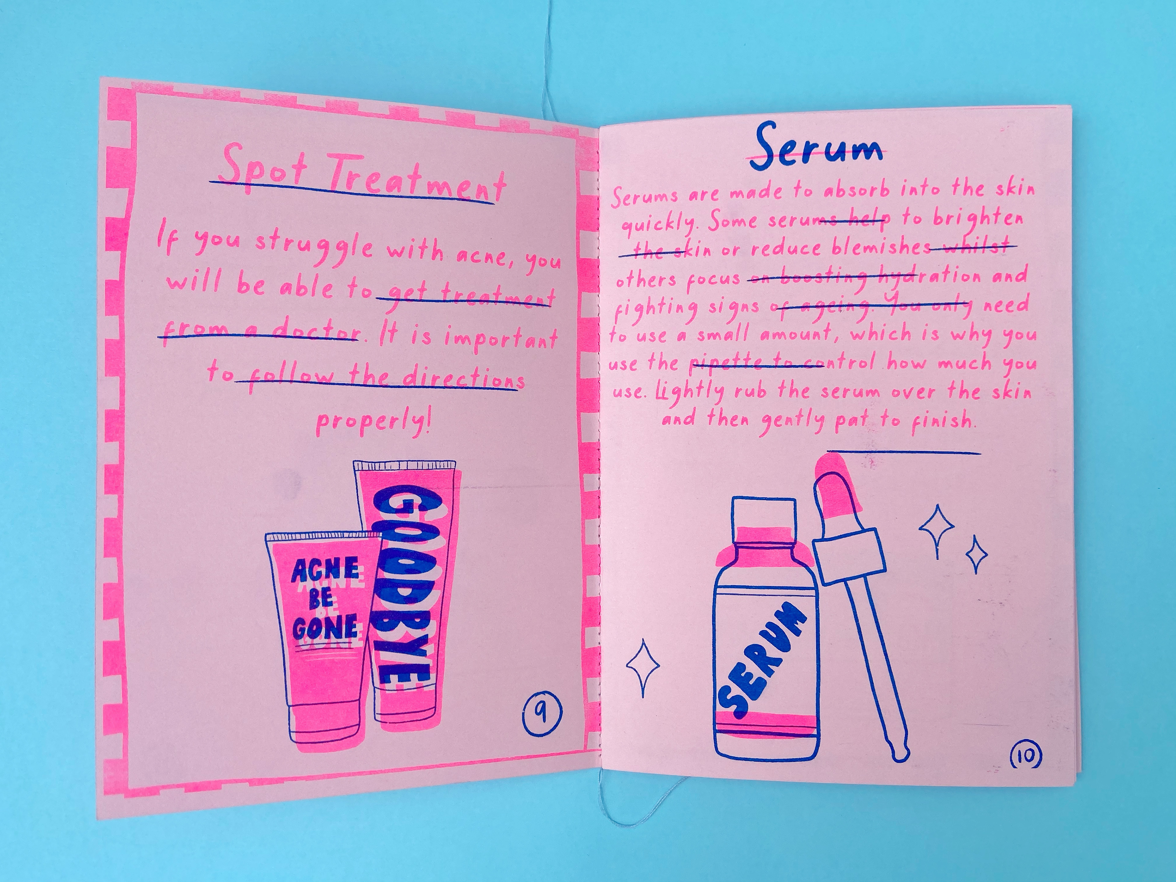 This zine was created in my second year of university using a risograph printer. We were tasked to create a set of instructions for a specific audience. I chose to make a guide to skin care, to help teens combat dry, greasy and acne prone skin.